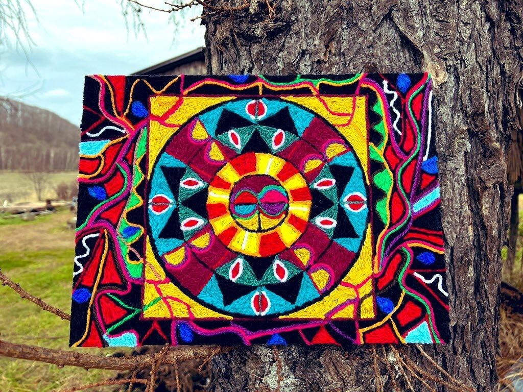 ネアリカ(Nierika)とは、メキシコのシエラ・マドレ山脈一帯に居住するウイチョル族のシャーマンの文化や、トランス状態になった時の世界を表現した毛糸絵のこと。「オタマティブアート」は、ホーリーバジル農家おたまが、日頃、自然界からいただいた言葉にならない情報を、ネアリカの独特なシャーマン感を活用して、ノーマインドで絵に落とし込んでいる作品です。